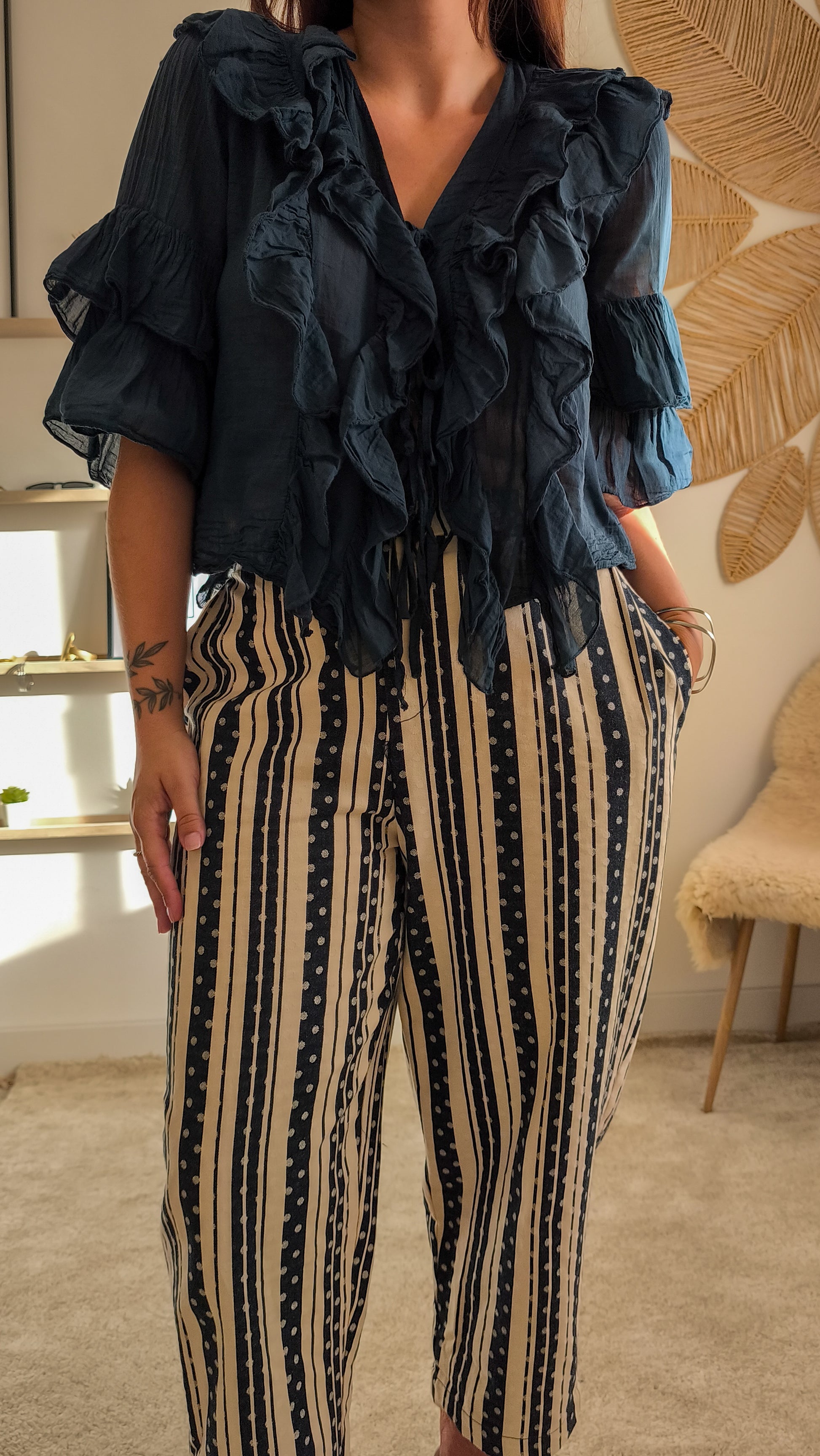 As calças Wendy são uma peça diferenciadora, que combina conforto natural do algodão com um design impactante. Perfeitas para quem procura estilo com qualidade duradoura, são ideais tanto em looks descontraídos com sapatilhas como em combinações mais sofisticadas com sandálias ou saltos.