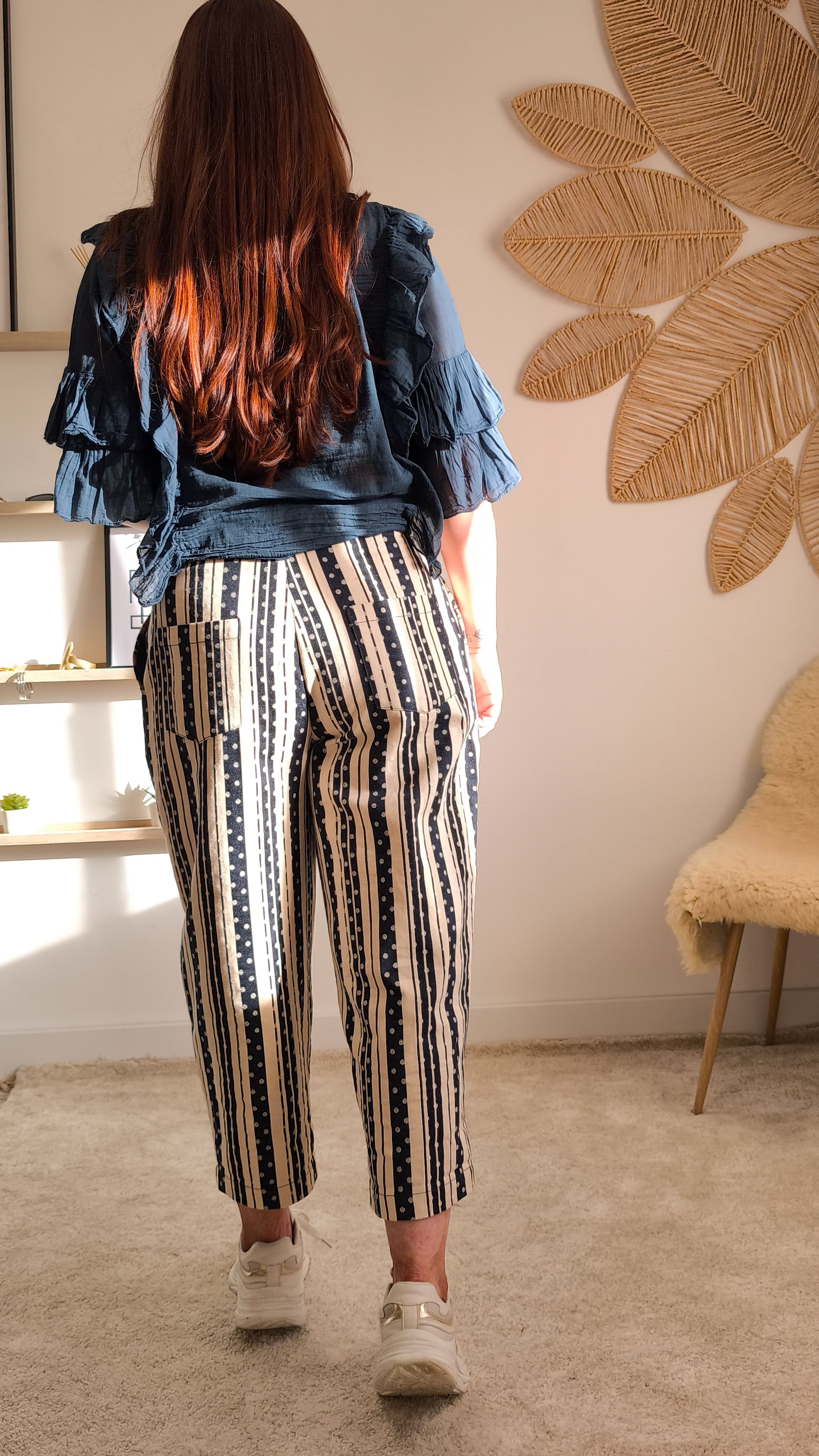 As Calças Wendy são 100% algodão, com padrão gráfico de riscas e pontos. Um modelo de corte regular e descontraído que alia qualidade premium a um design irreverente.