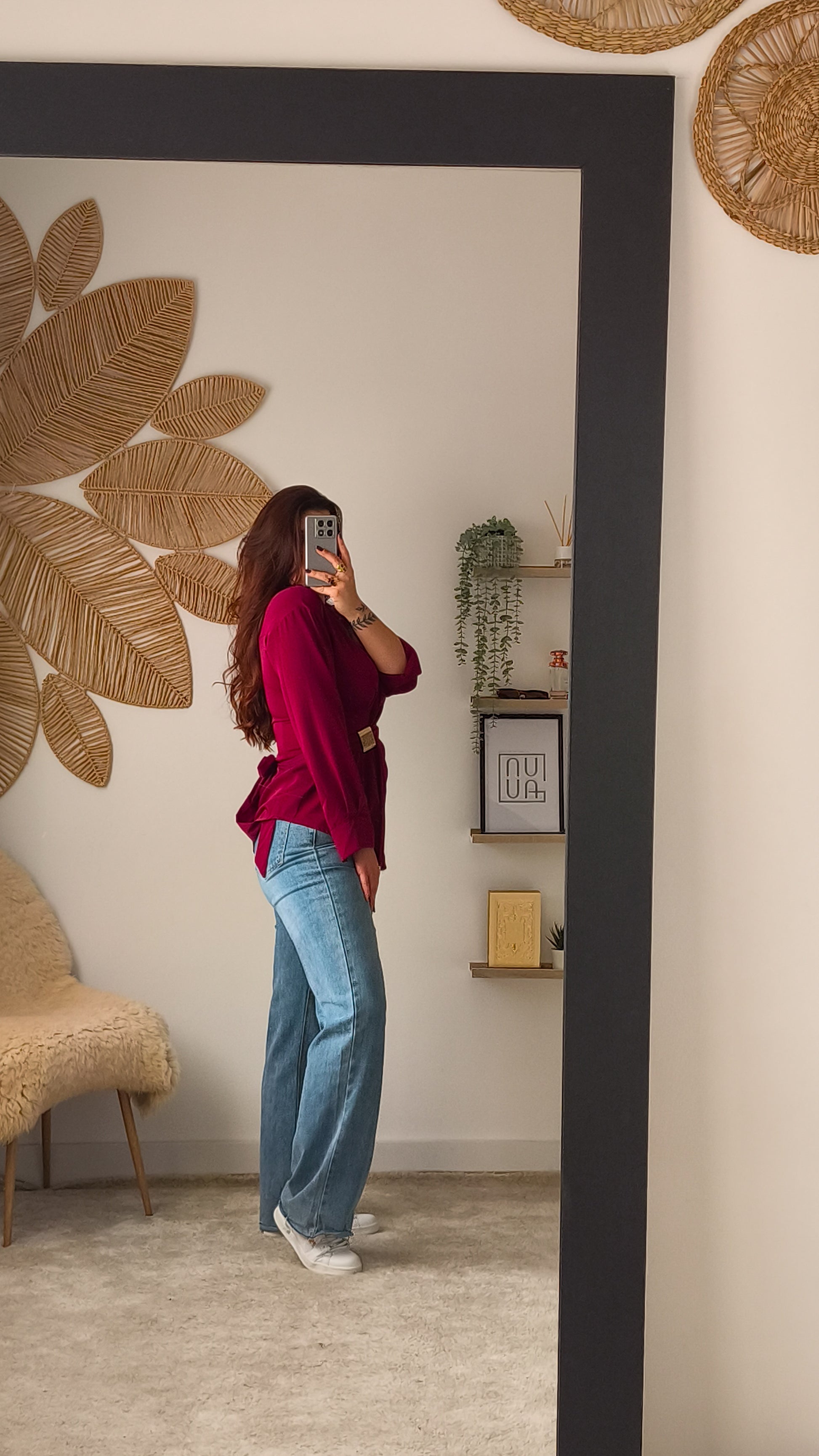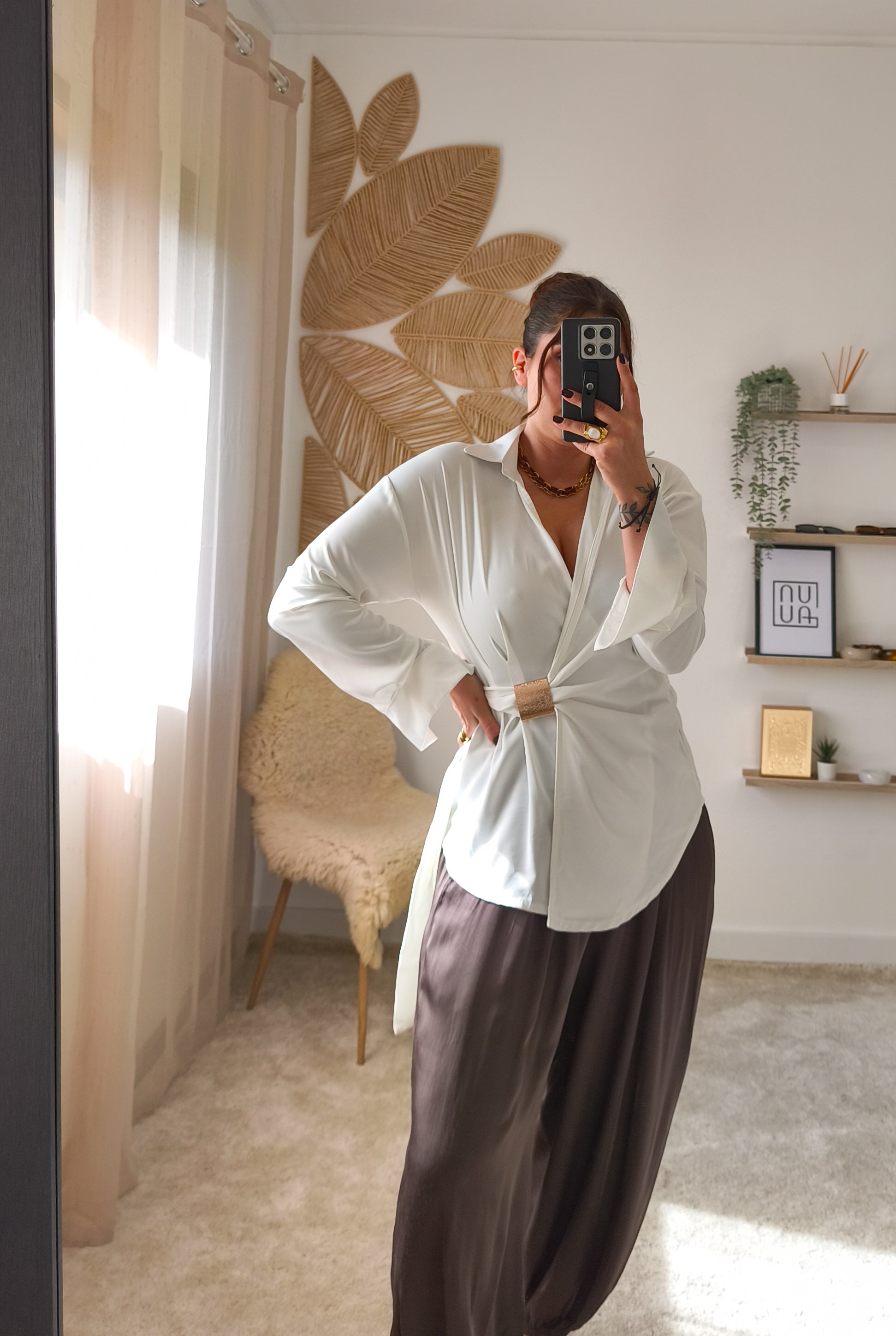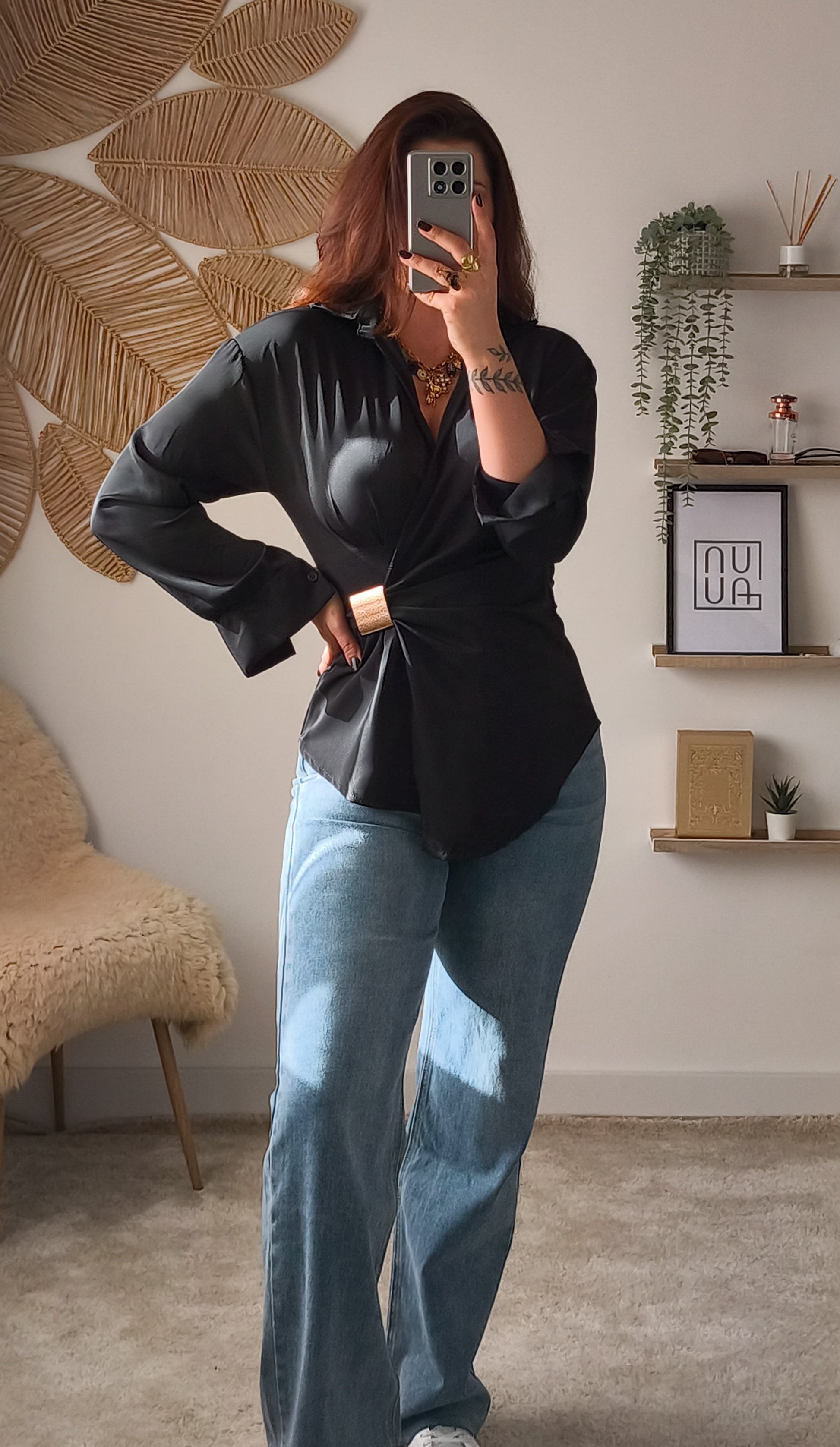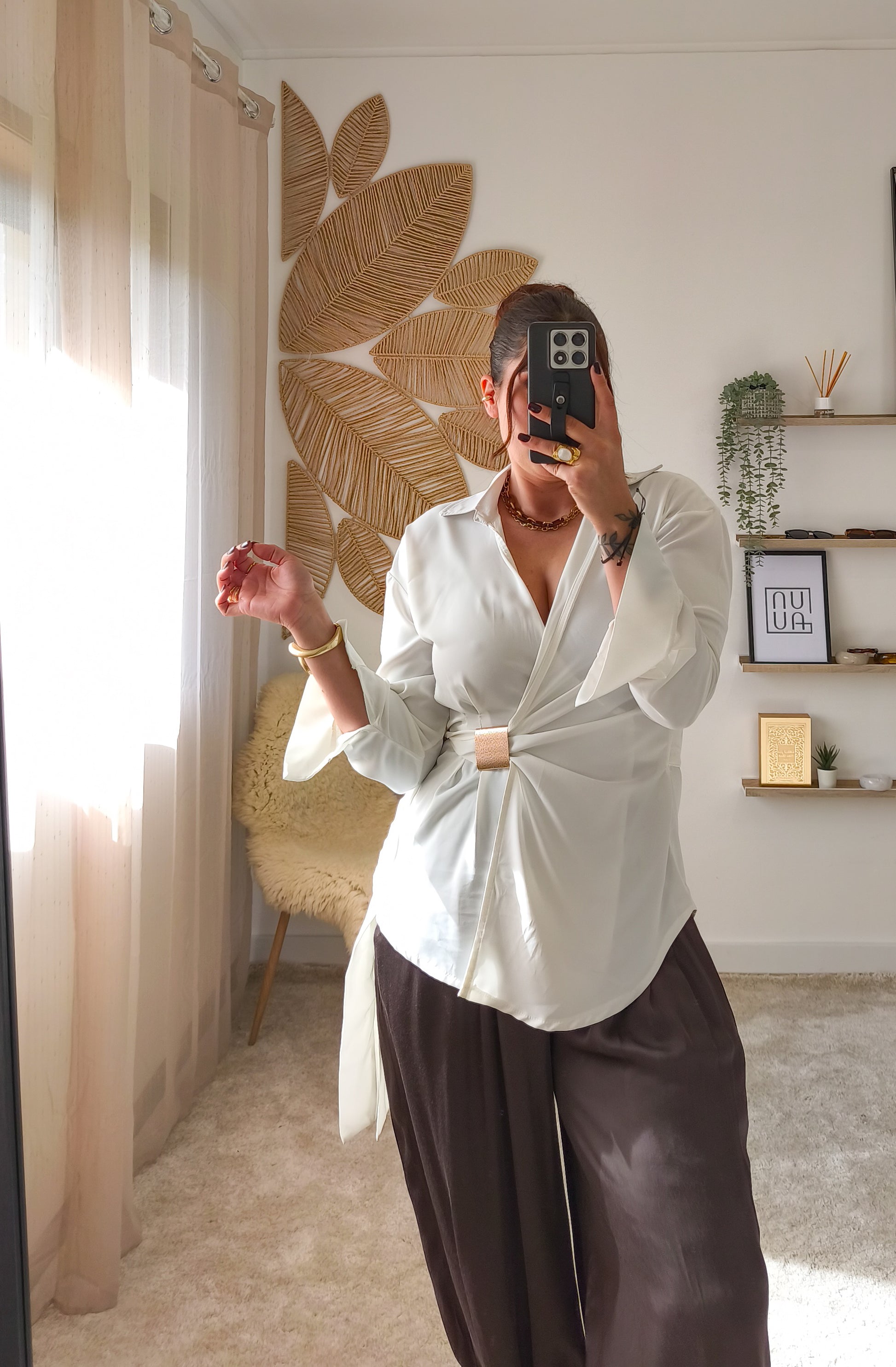 A fivela dourada valoriza a cintura e adiciona um toque sofisticado que funciona tão bem num look de escritório como num jantar especial. Versátil e sedutora, é aquela peça que eleva qualquer combinação de jeans ou saia lápis.