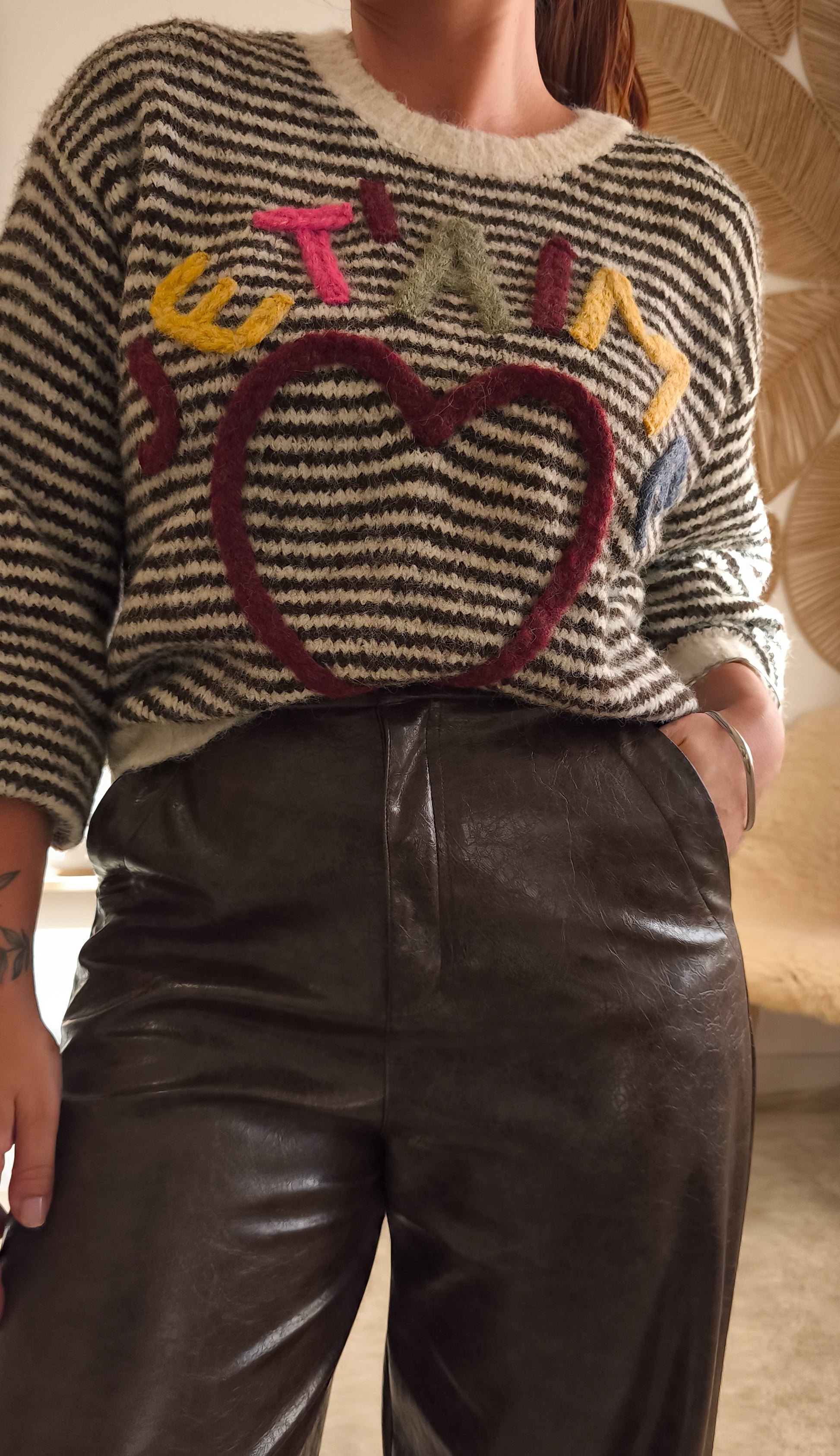 A Malha Je T'aime reinventa o tricot listado com uma aplicação colorida em relevo, transformando o básico num statement cheio de charme.