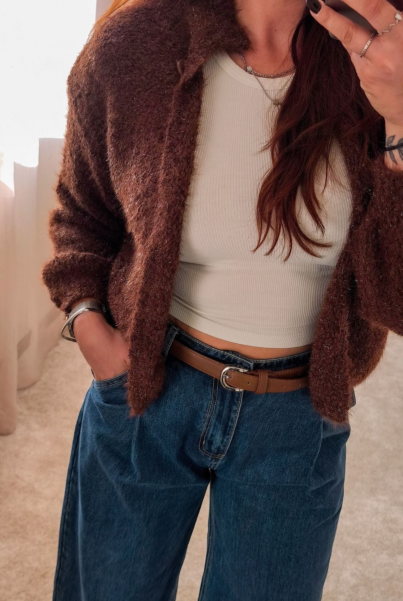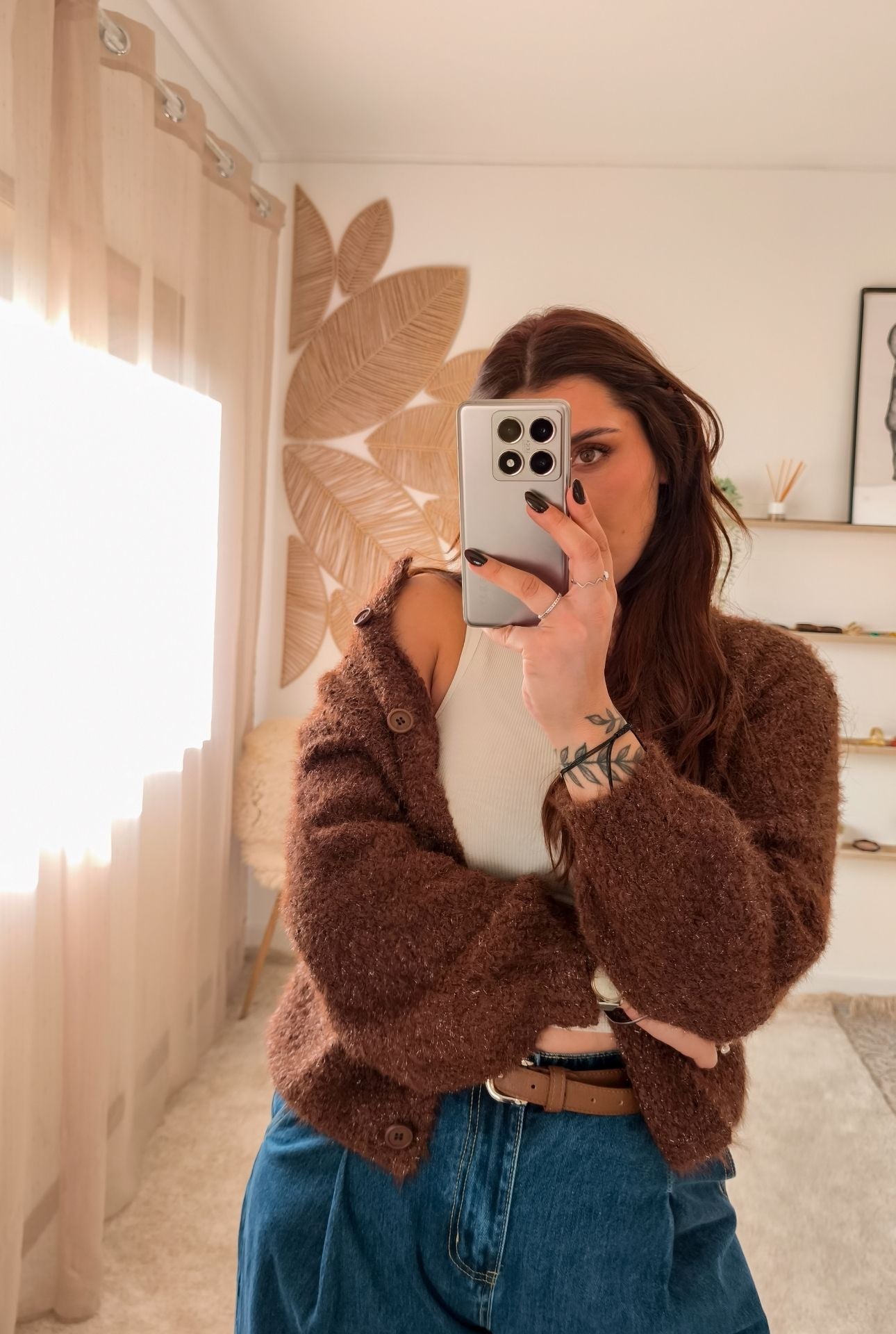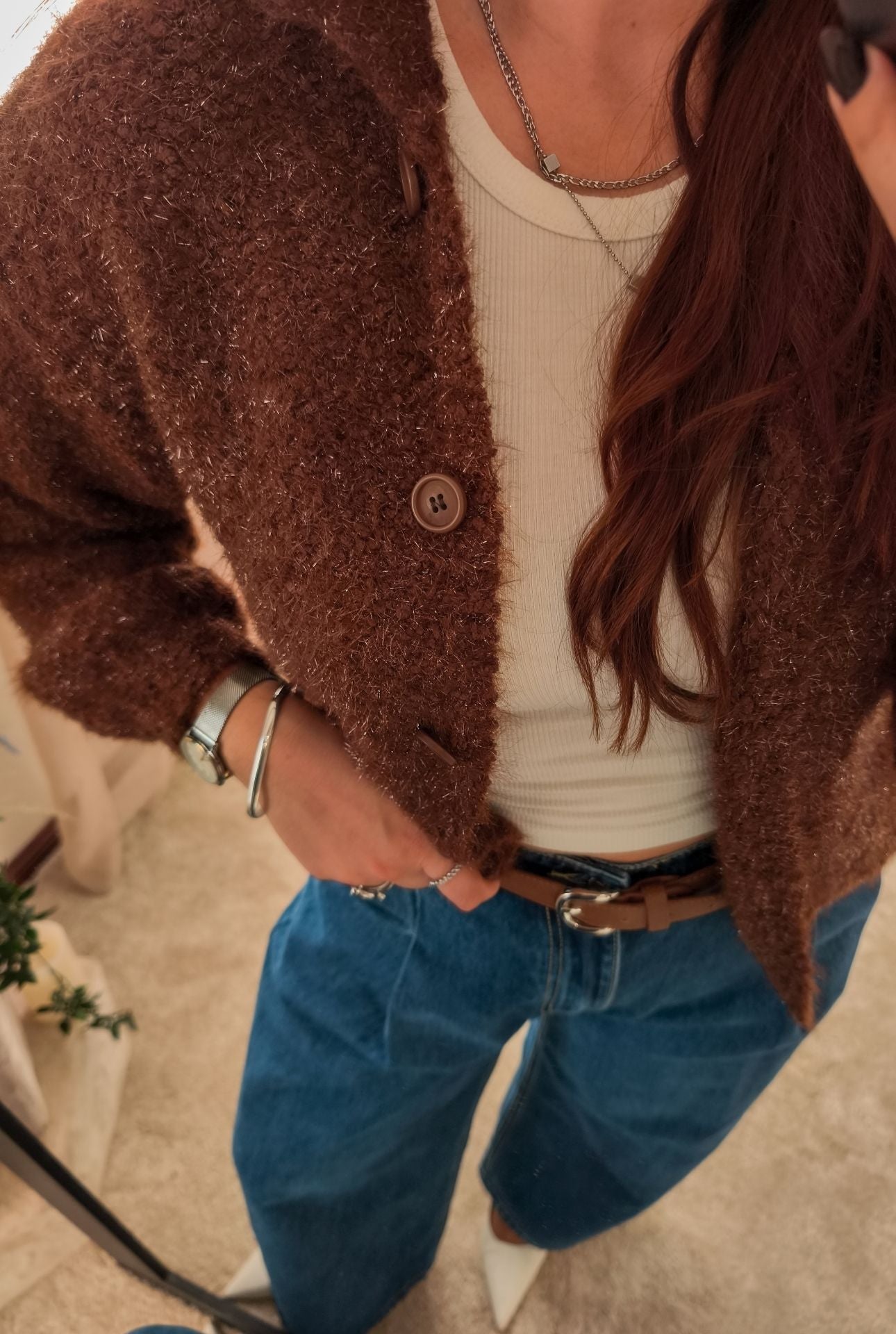 Porque é daqueles casacos que se usam sem pensar muito. Os brilhos subtis fazem dele a peça perfeita para dar aquele ar de look finalizado. É descontraído mas não desleixado. Perfeito para o café da manhã ou para uma saída mais casual.