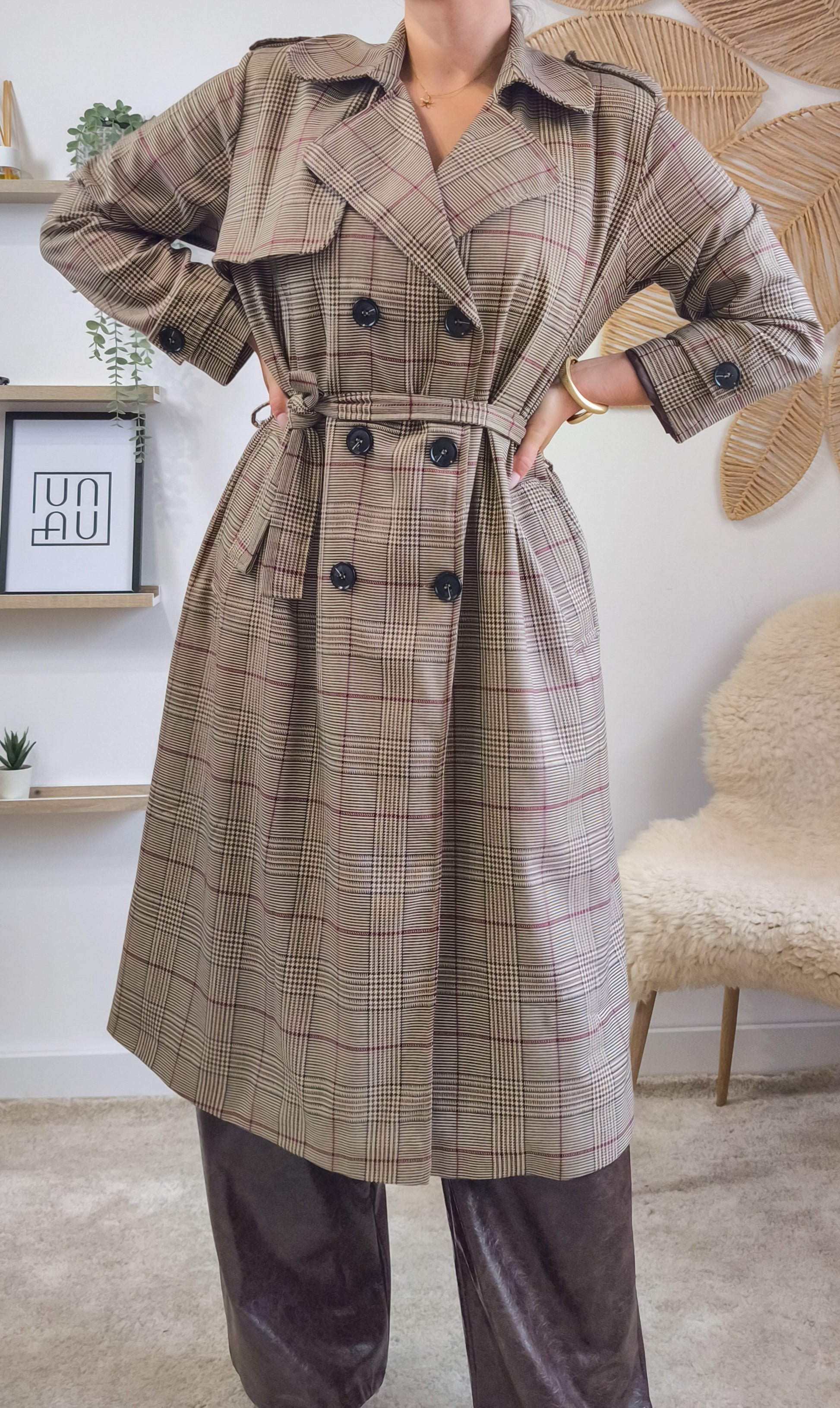 - Padrão xadrez em tons neutros com linhas subtis em bordô